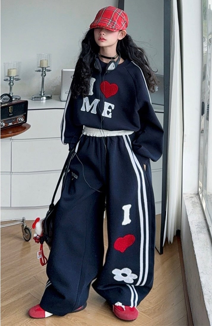 キュートさと個性が共存する、「I ♡ ME」スウエット セットアップです。