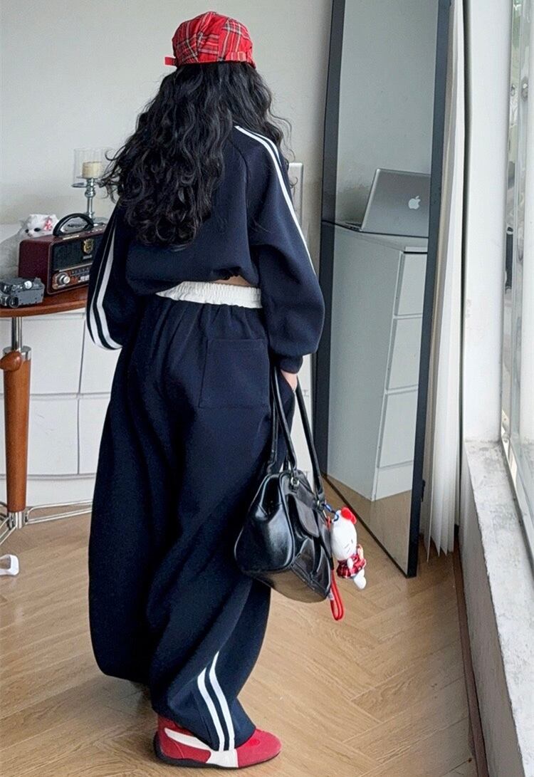 トップスは裾の調節が可能で、ヘソだしルックも楽しめるのがポイント!綺麗なシルエットのバレル型のボトムは動きやすく、両サイドにラインを施すことでカジュアル感アップ履くだけで「今どきルック」が完成します。